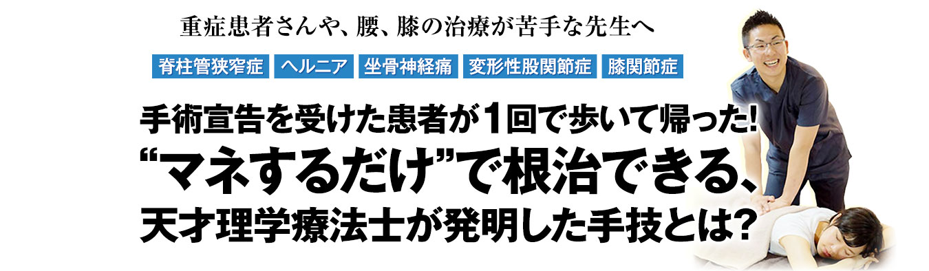 星野先生の「腰痛ハイパーテクニック」を使うことで、難治性の腰痛、坐骨神経痛、脊柱管狭窄症、