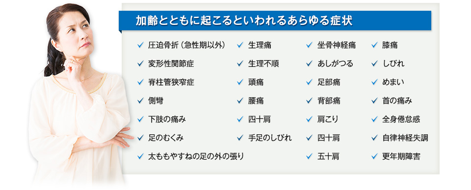 ひざ痛や肩こり、首こり、頭痛、・・・数えだすとキリがありませんが、全身のあらゆる慢性症状を根本的に改善することができます。