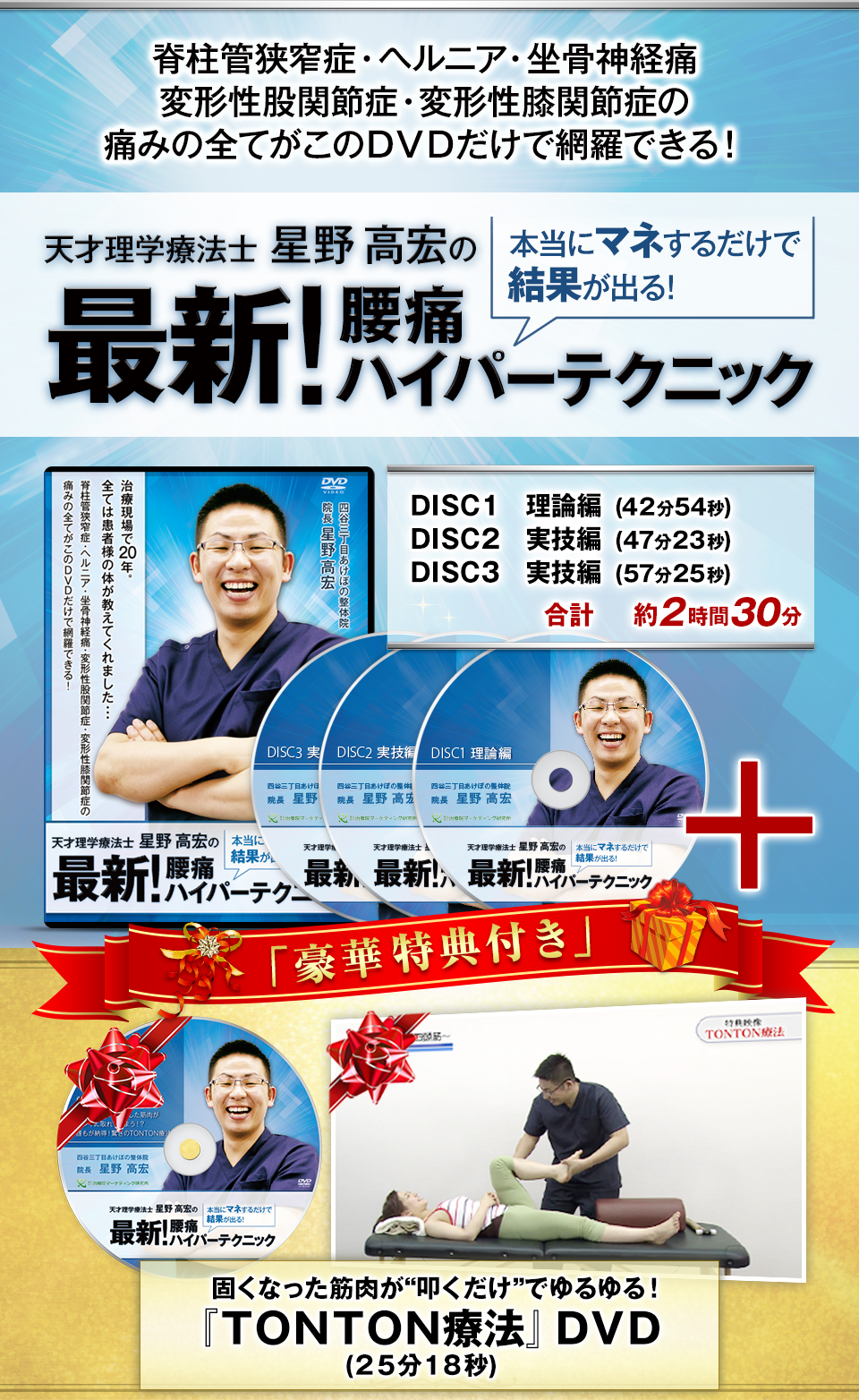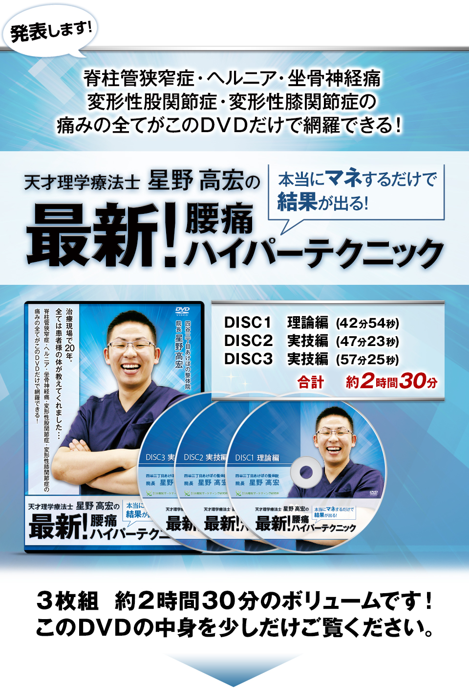 今回発表した「腰痛ハイパーテクニック」DVDは、元理学療法士の中でも、一流中の一流である星野先生が20年の歳月と1千万円以上の勉強代を掛けて研究開発し、完成させたテクニックです。