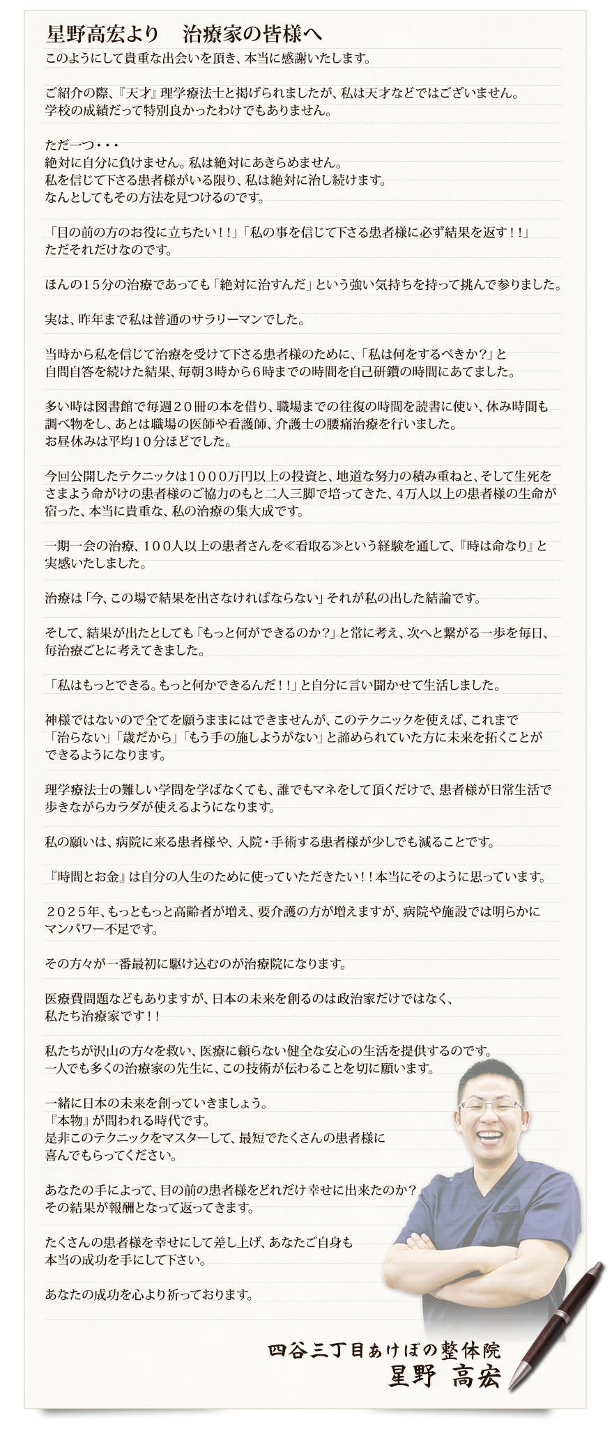 このように、老若男女を問わず熱狂的なファンを獲得し続けている星野先生が、この度、なぜ秘藏の手技を公開してくださることになったのでしょうか?